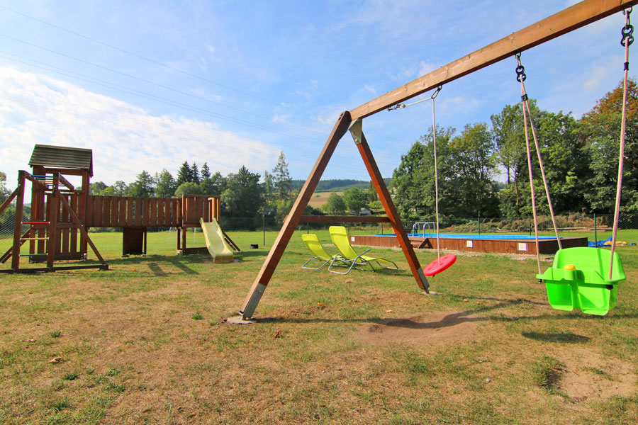 ADRSPACH FELSEN: Ferienhaus, auf einem Hügel, am Ende des Dorfes in einem privaten Bereich (Schwimmbad, Spielplatz, Trampolin, Schaukeln, Sandkasten) mit WIFI und Blick auf die Umgebung, nahe der Grenze zu Polen, 12 km von Teplice nad Metují, 15 km von Adršpach und 24 km von Trutnov entfernt. ACHTUNG: In der Anlage 5x identisch ausgestattete Hütte.