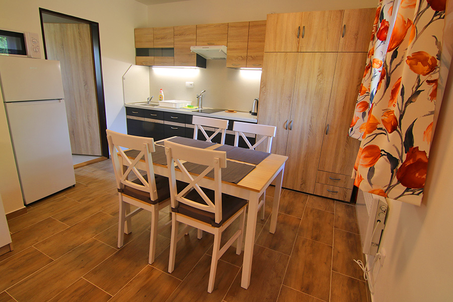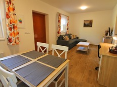 Im Gebäude im Erdgeschoss: Wohnzimmer (Schlafsofa - 1x Zustellbett, TV, Couchtisch) mit Kochnische (Cerankochfeld, Kühlschrank + Gefrierfach, Mikrowelle, Wasserkocher, Tisch + Stühle), 1/4 Schlafzimmer (2x Doppelbett), Badezimmer (Duschkabine, Waschbecken, Toilette). Heizung: elektrisch (direkte Heizungen).