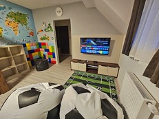 Obergeschoss: 1x Fünfbettzimmer (Doppelbett, Etagenbett – dieses Etagenbett kann auch für Kinder genutzt werden, Badezimmer – Dusche, Waschbecken, Toilette, Kinderecke mit PlayStation und 1x extra festes Zusatzbett – dieses können Sie nach Ihren Wünschen in ein anderes Schlafzimmer stellen), 1x Dreibettzimmer (Doppelbett und Einzelbett, Badezimmer – Dusche, Waschbecken, Toilette), separates Badezimmer (Dusche, Waschbecken, Toilette), 1x Doppelzimmer (mit kleiner Küchenzeile und Sitzecke), 1x Dreibettzimmer (Doppel- und Einzelbett, Badezimmer – Dusche, Waschbecken, Toilette). Heizung: elektrisch (Fußboden und Heizkörper). Babybett (kostenlos, bringen Sie Ihre eigenen Bettdecken und Laken mit). TIPP: Die Zimmer haben ein eigenes Bad, es gibt keine Warteschlangen. EXKLUSIVES ANGEBOT BEI UNS. EXKLUSIVES ANGEBOT BEI HOLIDAY-TSCHECHIEN.COM – BESTE PREISE.