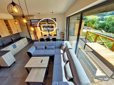 Bei Objekt:PRIVATE Wellnessbereich mit Infrarotsauna, Jacuzzi und Indoor-Relaxbereich (alles überdacht), teilweise überdachte Terrasse, Grill, 2x Liegestühle, Sonnenschirm, Blick auf die Berge (insbesondere Montenegro), Parkplatz für bis zu 3 Autos am Haus.